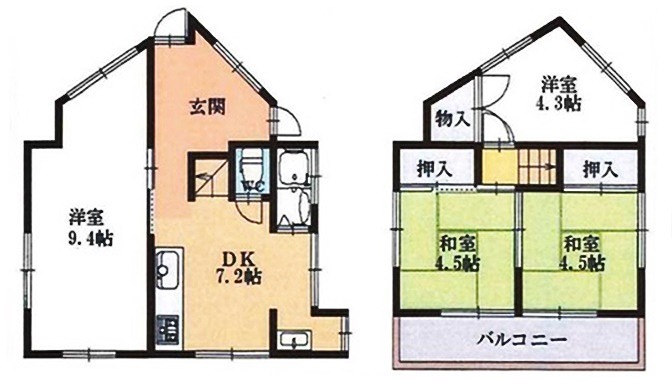 和室4.5畳 2階 2室 洋室9.4畳 1階 1室 洋室4.3畳 2階 1室 DK7.2畳 1階 1室 |